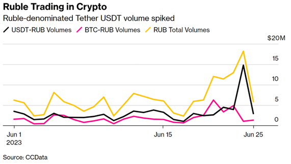 - Digital assets also demonstrated their appeal in the face of government instability; during the apparent Russian coup attempt on Saturday, Ruble-denominated Tether stablecoin trades more than tripled on a daily basis