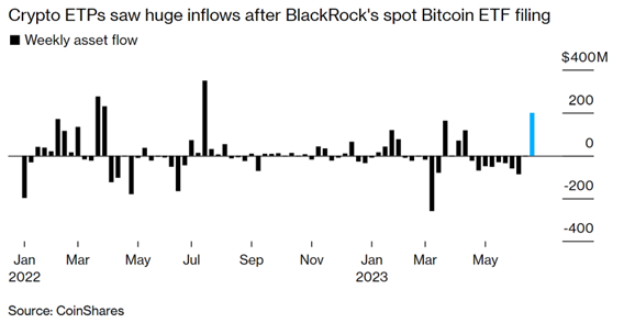 - Renewed interest in Bitcoin ETFs also led to major growth in crypto ETP inflows, achieving their best week (nearly $200m) since July last year