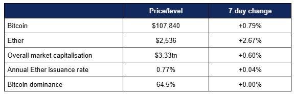 Digital assets exhibited modest growth as Ether stole some of Bitcoin’s spotlight thanks to a growing global focus on the potential of stablecoins. Deutsche Bank became the latest big TradFi name to increase its industry involvement via custody plans, the House of Representatives announced an impending focus on digital asset legislation, JP Morgan and Robinhood both made strides in tokenisation, Elon Musk voiced Bitcoin support during the creation of a potential political party, and much much more.
