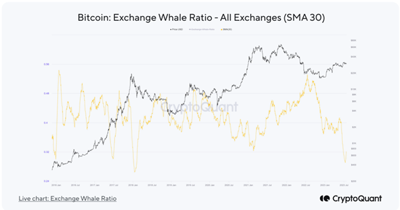 - For instance, the “exchange whale ratio” indicates that percentage of exchange inflows from whales has reached a 5-year low, meaning fewer whales sending their Bitcoin onto exchanges (which is taken as analogous to selling intent)