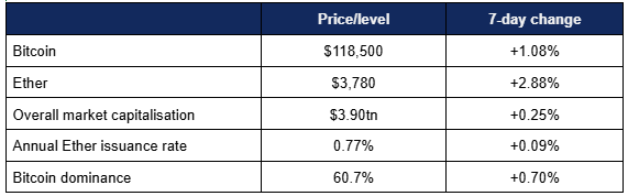 Digital assets had a comparatively sedate week after a run of historic performances, but nonetheless managed to post modest growth. Tokenisation came to the fore once more as Goldman Sachs and BNY announced a new money market project, Ether ETFs outperformed spot Bitcoin funds, one of the masterminds behind BlackRock’s dive into digital assets moved to a crypto treasury firm, stablecoin development continued, Christie’s launched a new division for digital asset real estate deals, and much, much more.